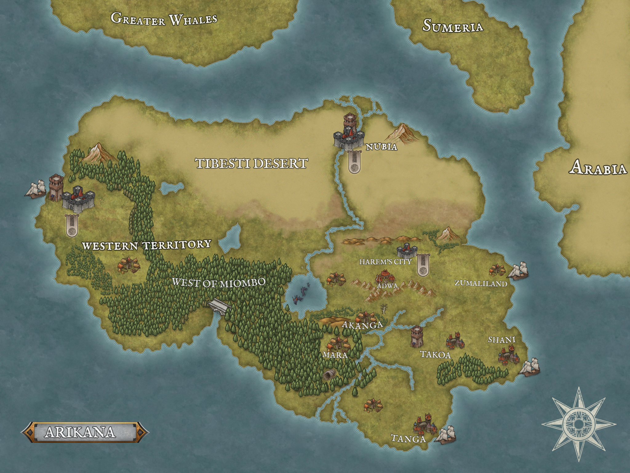 TÍÍRI consisted of Greater Whales and Sumeria in the North, the Western continents of Arabia and Ozenu, the Eastern continents of Amerigo and Tasilia, and much later, the lonely empty lands in the middle of the waters, Arikana.